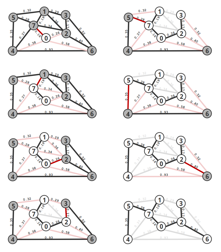 - Wiederhole Schritt 2 & 3 bis der MST Kanten hat oder keine Kante mehr in der Liste der kreuzenden Kanten liegt