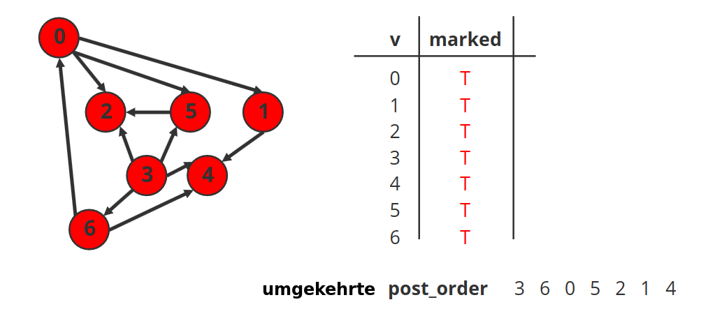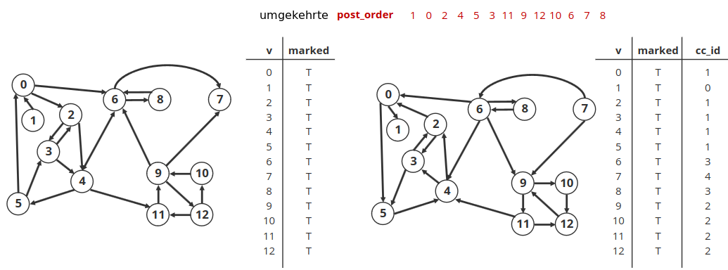 - Phase 2: Tiefensuche auf (ursprünglichem) Digraphen laufen lassen mit Knotenreihenfolge aus Phase 1