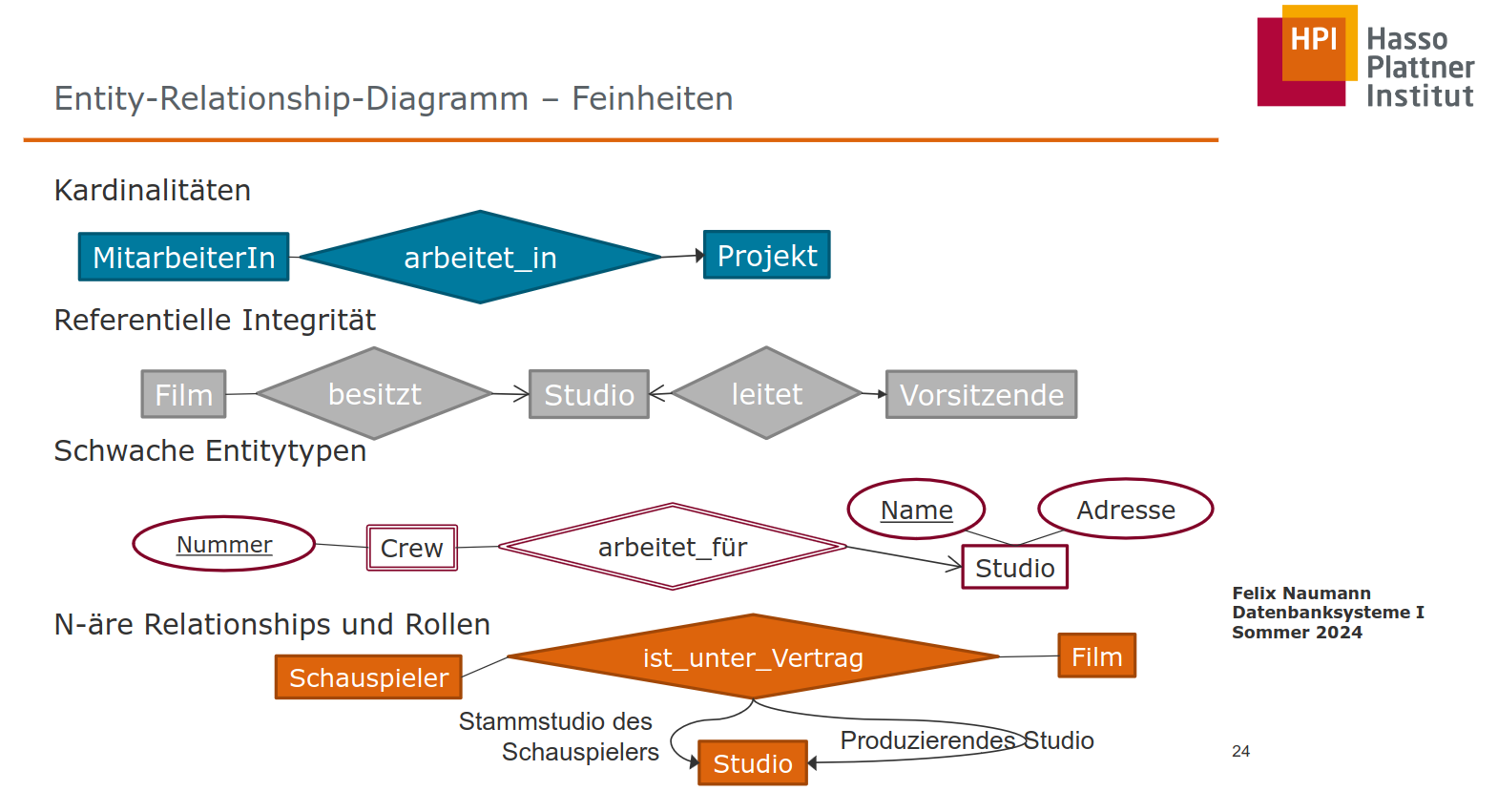 - Relationshiptypen + Relationships (zwischen obigen Entitäten, meist binär)