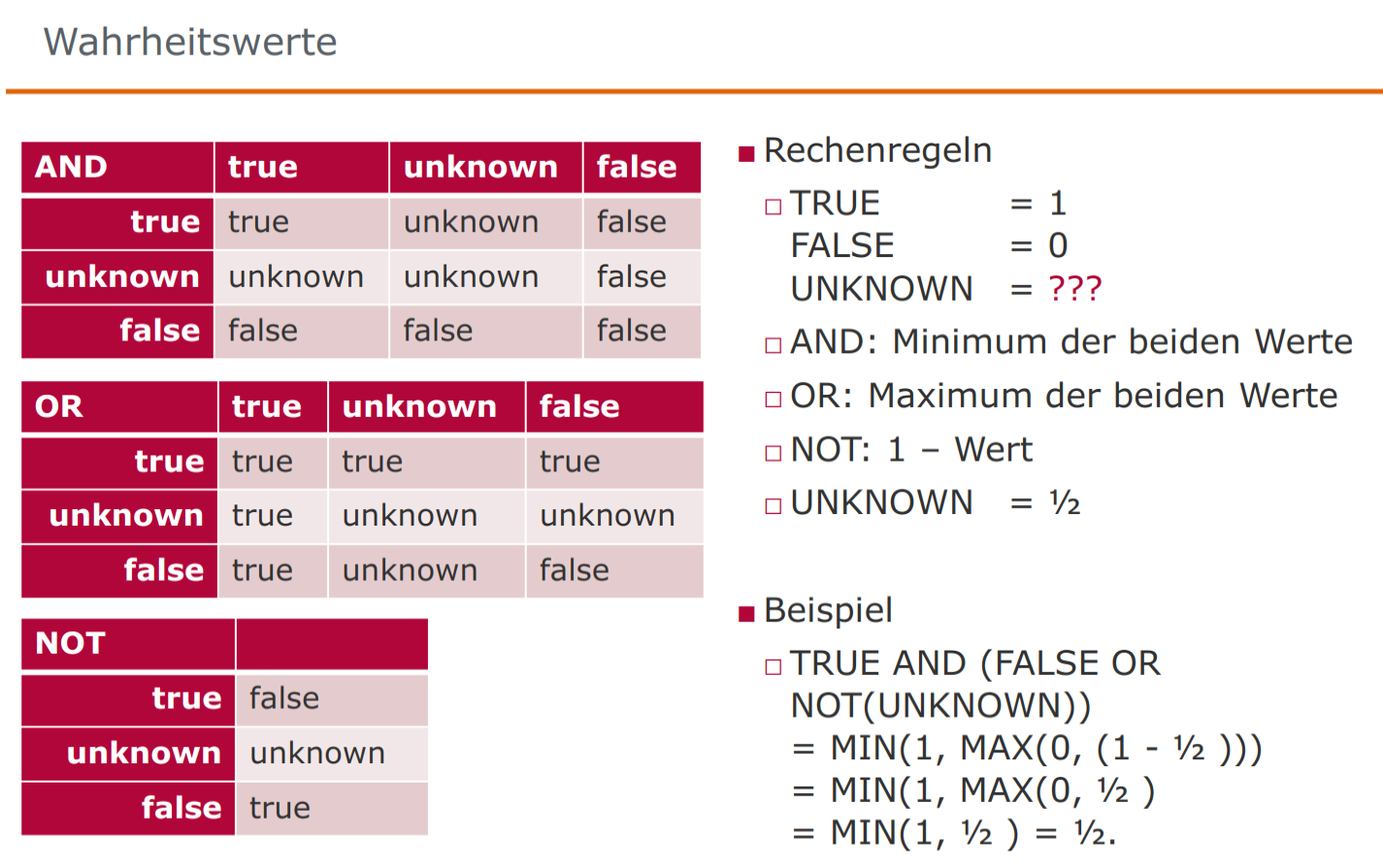 EXISTS R: gibtTRUEzurück, fallsRnicht leerx IN R: gibtTRUEzurück, fallsxgleich einem Wert inRx NOT IN Rbzw.x <> ALL R: gibtTRUEzurück, fallsxkeinem Wert inRgleichtx > ALL R: gibtTRUEzurück, fallsxgrößer als jeder Wert inR- entsprechend für die anderen Vergleichsoperatoren