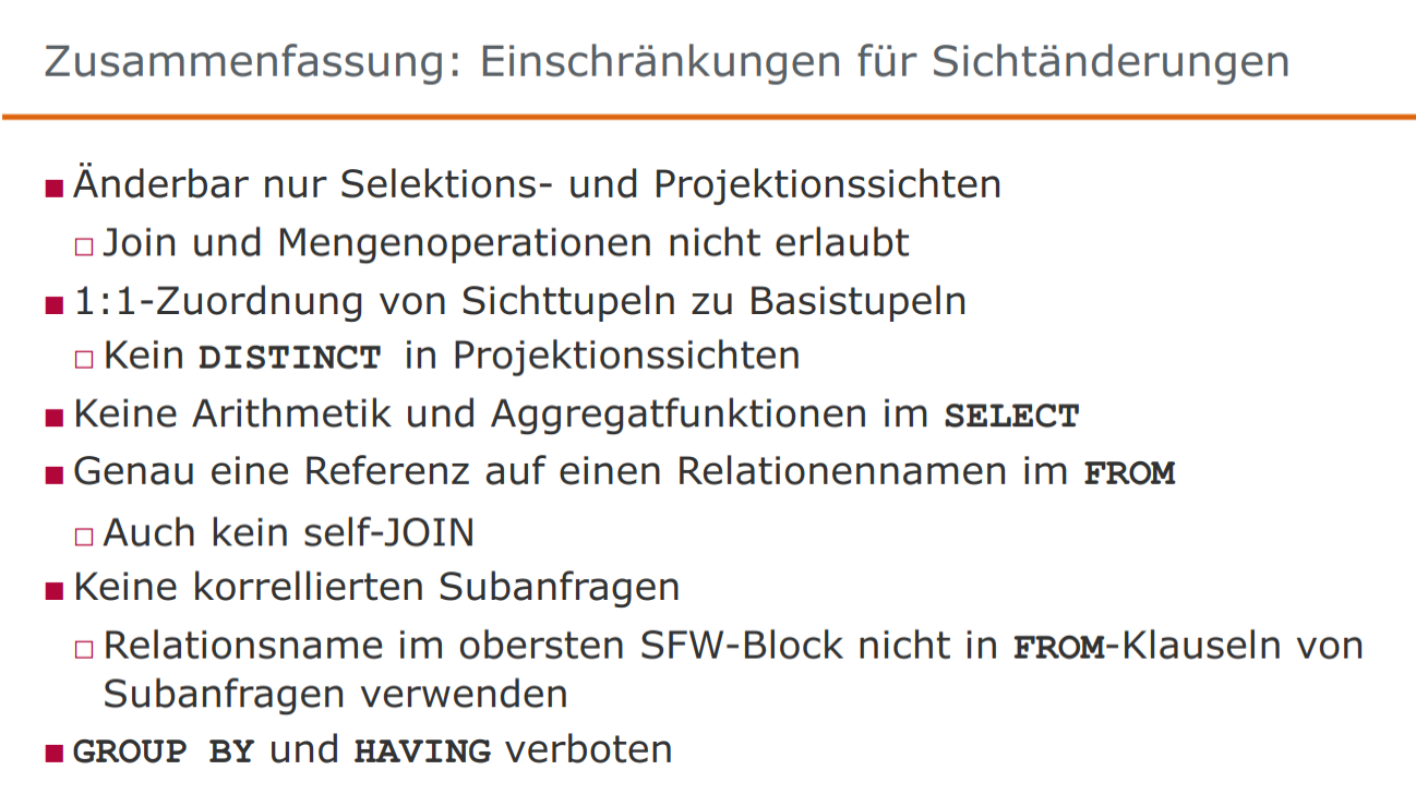 - in einigen Fällen ist es möglich, Einfüge-, Lösch-, oder Updateoperationen auf Sichten durchzuführen