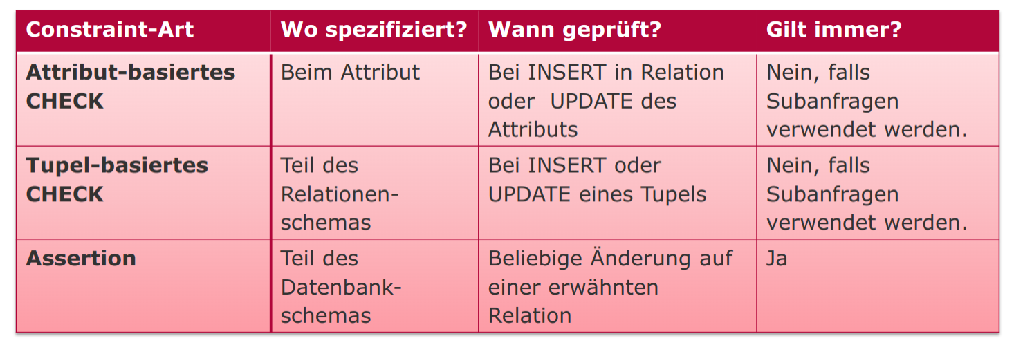 CHECK-Bedingung immer geprüft, kann also auch bei Bezug auf andere Relation nicht umgangen werden- Teil des Datenbankschemas