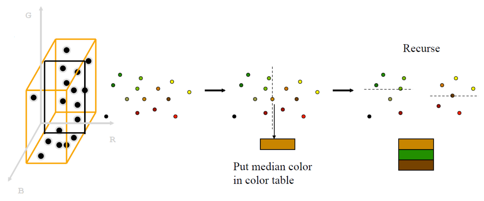 - rekursive Unterteilung des RGB-Farbraums in RGB-Farbwürfel mit gleicher Anzahl an enthaltenen Farben