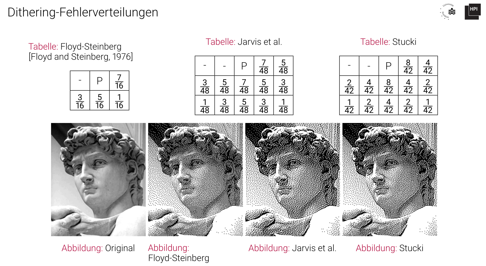 - Error Diffusion Dithering: Lineare Verarbeitung des Bildes (z.B. links recht; oben unten), wobei erzeugter Fehler (z.B. bei Farbtiefenreduktion) auf lokale Pixelumgebung in Richtung der Traversierung (hier rechts und unten; links unten auch erlaubt) verteilt wird