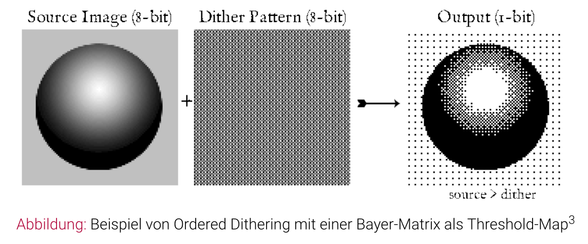 - alternativ Ordered Dithering mit Threshold-Map, bei der die Farbwerte des Bildes mit der Map verglichen werden (GPU-unterstützt, kann aber zu erkennbaren Mustern führen)