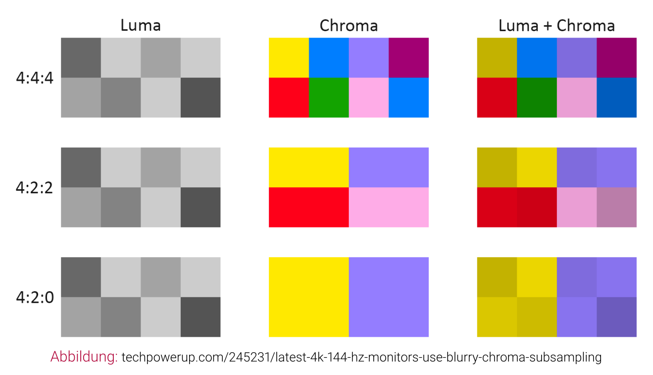 - YIQ: enthält Schwarz-Weiß-Kanal (Y, entstanden durch Wechsel auf Farbfernsehen) und Chroma-Koeffizienten I (in-phase, Cyan Orange) sowie Q (quadrature, Magenta Grün)