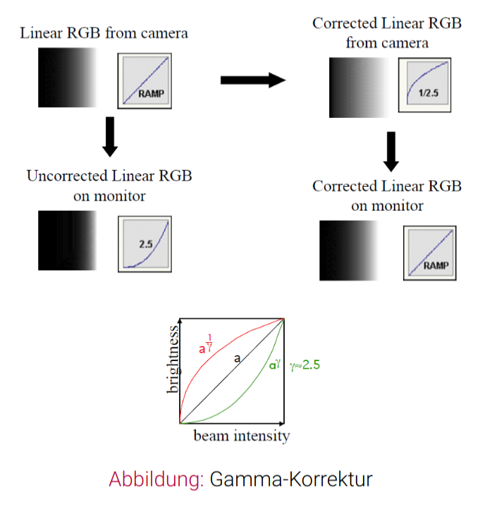 - Gamma-Korrektur bezeichnet nichtlineare Voranpassung der RGB-Werte, mit dem Ziel der linearen Darstellung der RGB-Werte im Ausgabegerät