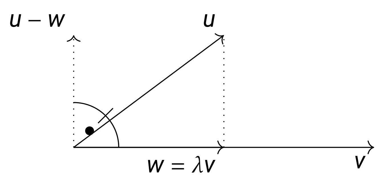 Ausgehend von den beschriebenen Eigenschaften des Skalarprodukts lässt sich ein Vektor wie folgt orthogonal auf einen Vektor projizieren. Den projizierten Vektor bezeichnen wir mit . Die Vektoren und sind orthogonal zueinander, sodass gilt