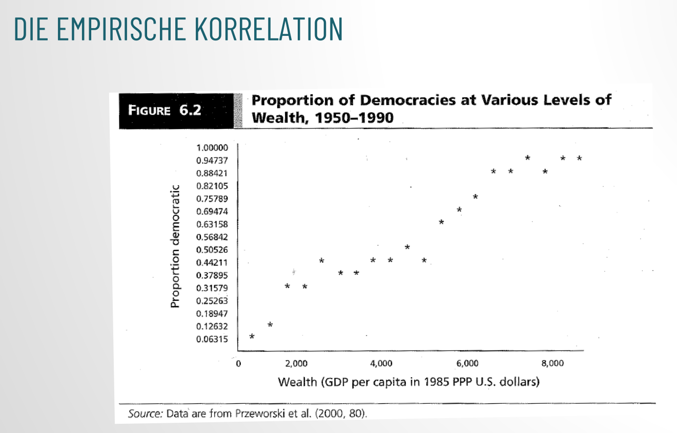 - Empirischer Ausgangsbefund: Deutliche Korrelation zwischen Reichtum (Pro-Kopf-Einkommen) und Demokratie