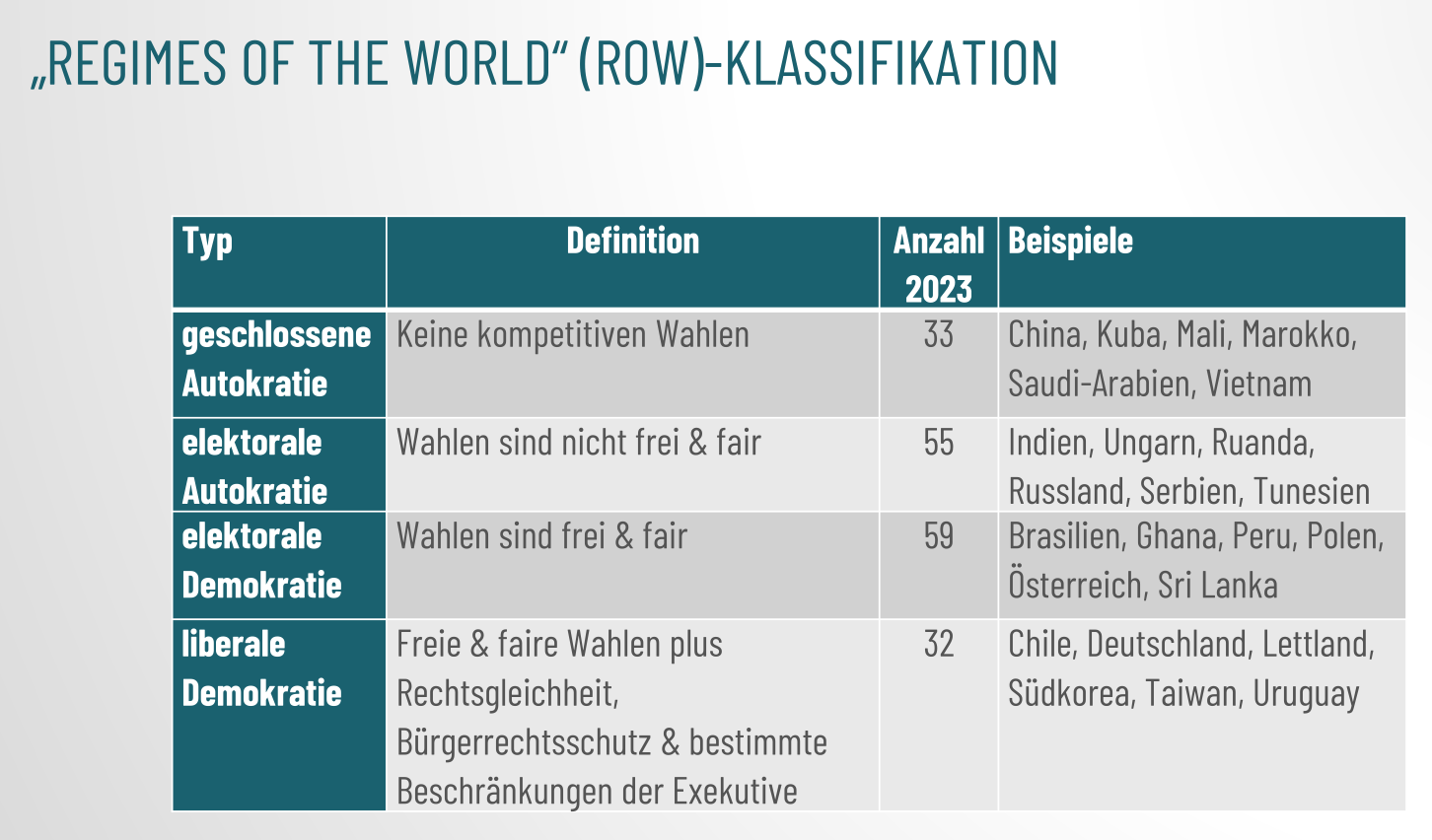Die Regimes of the World (ROW)-Klassifikation unterscheidet vier Typen politischer Herrschaft: