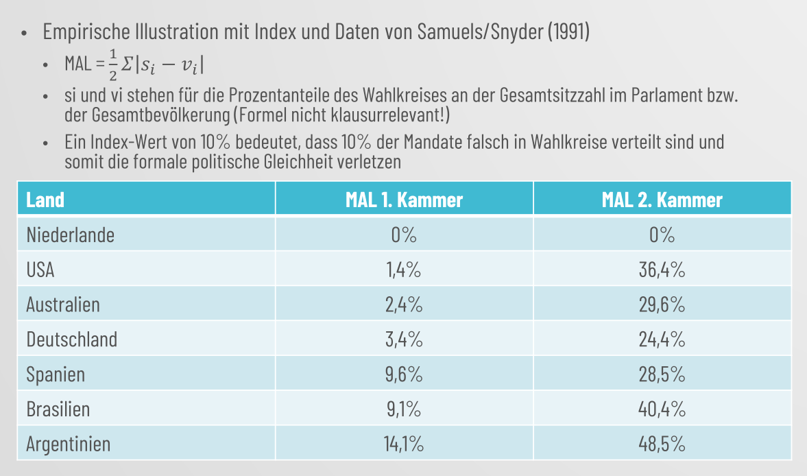 Politische Gleichheit: Da territoriale Repräsentation selten funktioniert, unterlaufen 2. Kammern häufig schlicht den Wert der politischen Gleichheit (Malapportionment)
