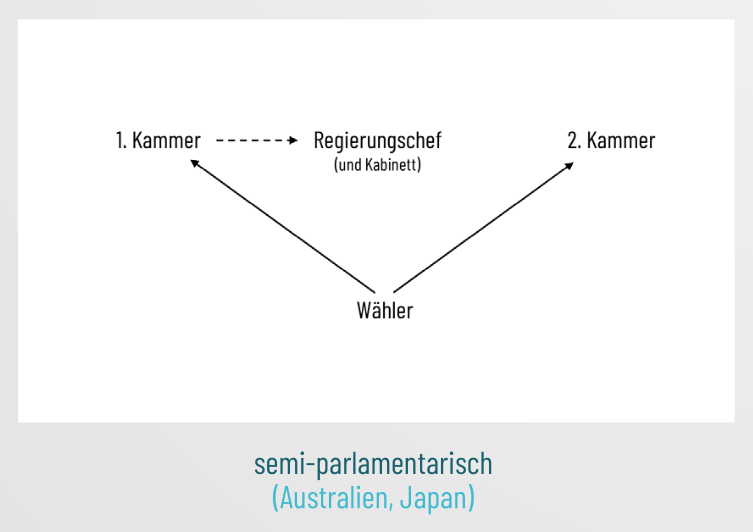 - Bei Direktwahl ohne Misstrauensvotum entsteht (nach Ansicht einiger Autoren) ein eigenständiges Regierungssystem: Semi-Parlamentarismus