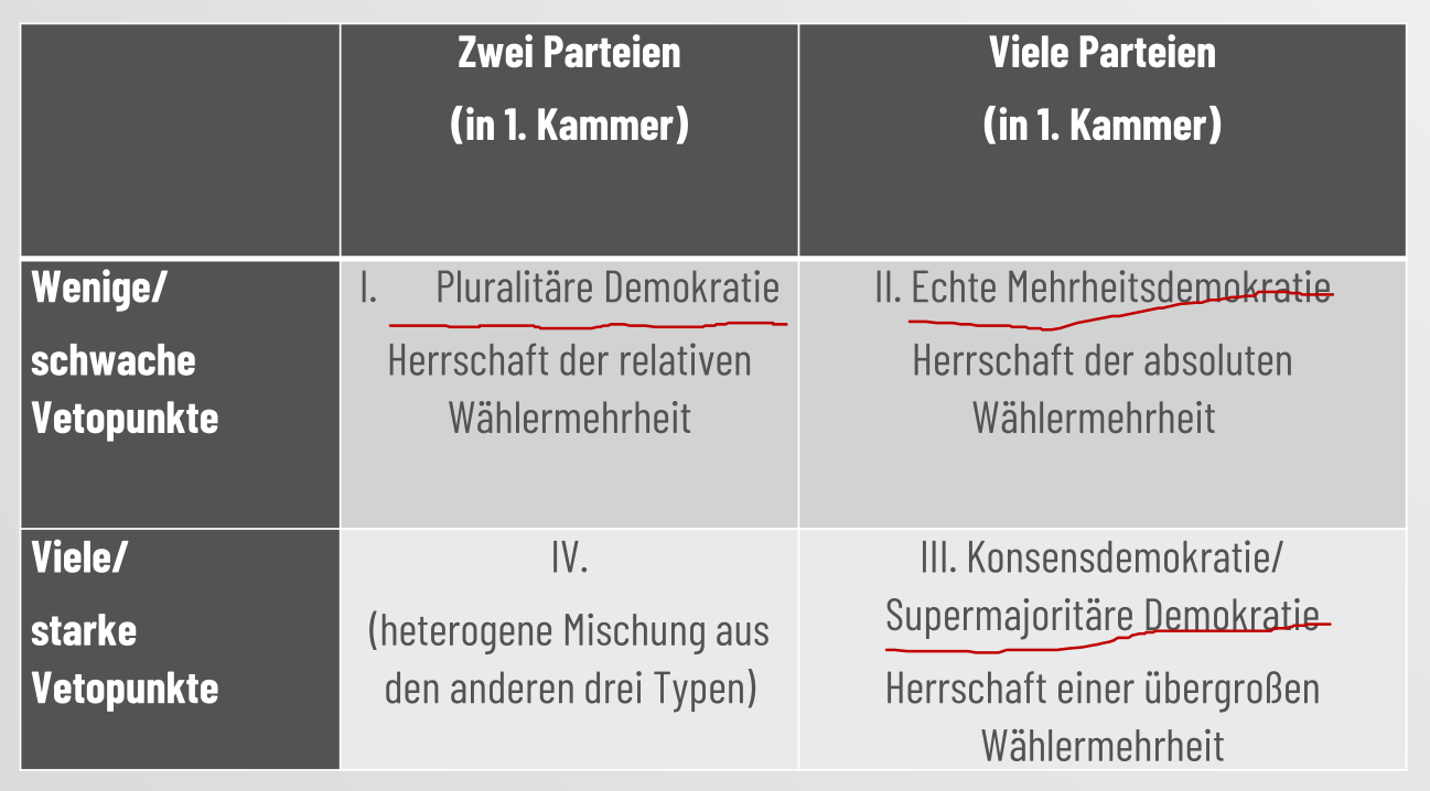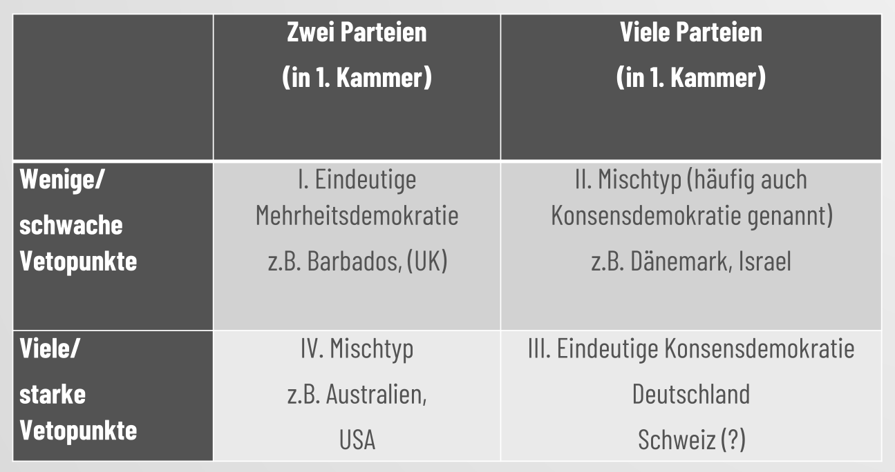 - bei Lijphart: föderaler Staatsbau | starke zweite Kammer | starke Verfassungsgerichtbarkeit | schwer zu ändernde Verfassung | unabhängige Zentralbank