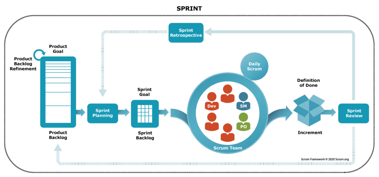 • ends with two reviews: Sprint Review (work completed) & Sprint Retrospective (process)